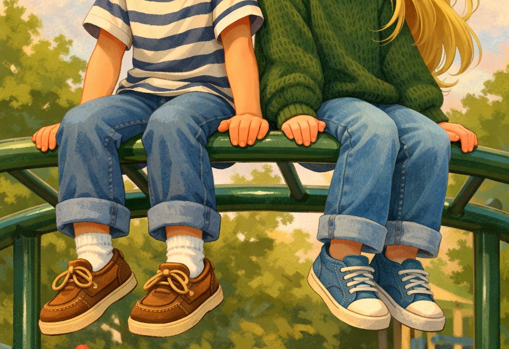 This same Andrea sat with me atop the monkey bars three or four years later. I still loved her, believed we would marry—believed God himself made her for me. But on some typical school day, we sat there during recess, eight feet off the ground, facing each other. Out of nowhere, she said: “you really shouldn’t wear socks with those shoes.” I was wearing sperrys, boat shoes. And white socks.